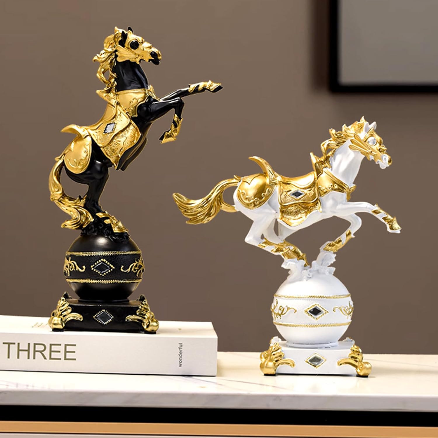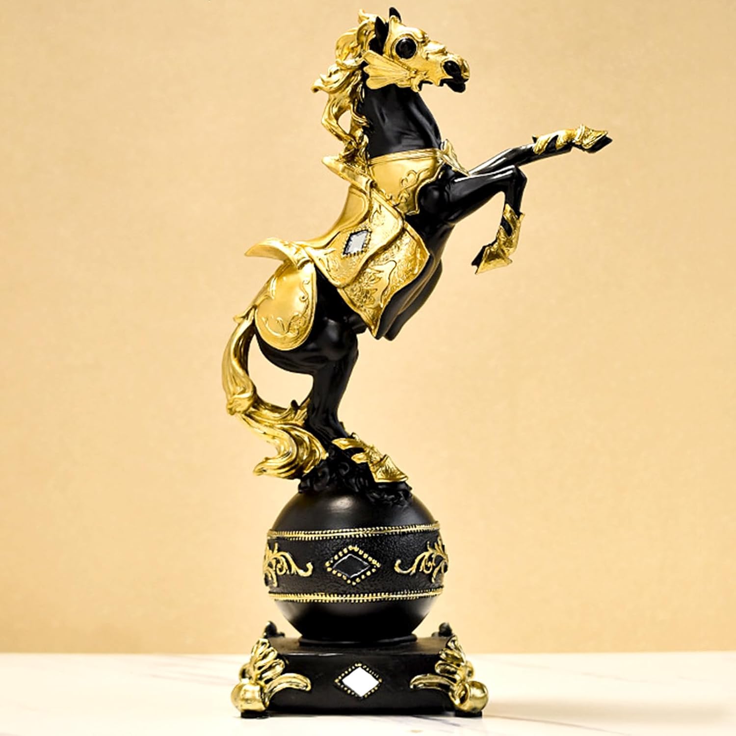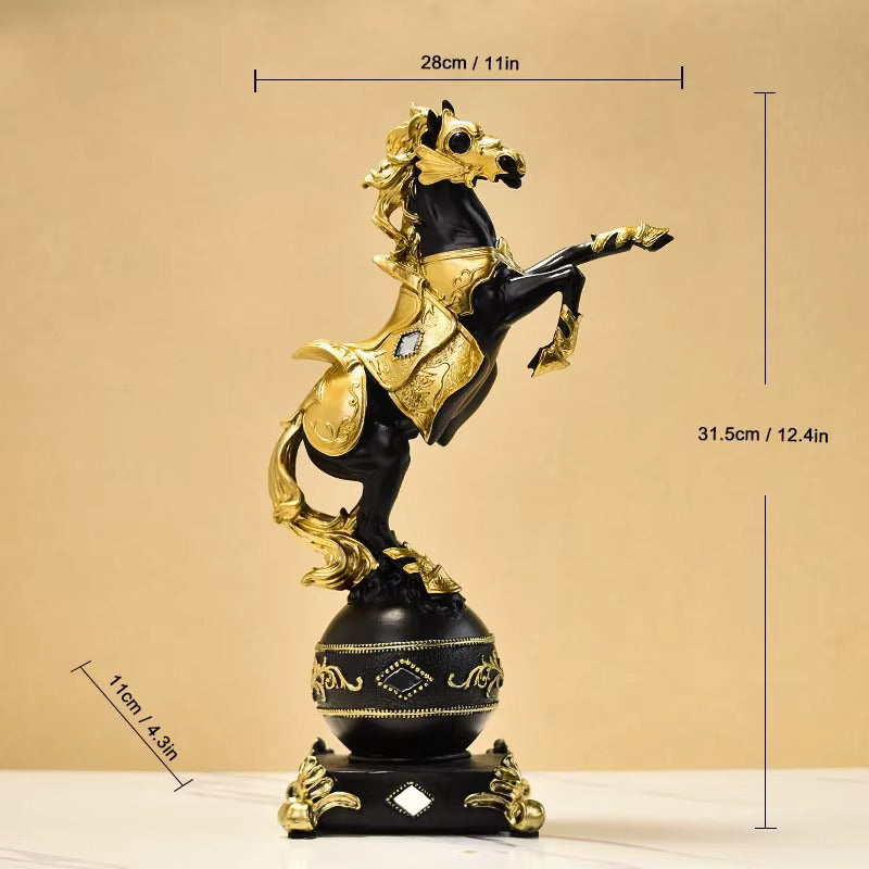 თუ ეძებთ შთამბეჭდავ და განსხვავებულ დეკორს, რომელიც ერთდროულად გამოხატავს ძალას, ამბიციას და ელეგანტურობას — ეს სკულპტურა იდეალური არჩევანია. შავი და ოქროს კომბინაცია ქმნის მდიდრულ ვიზუალს, ხოლო აღმართული ცხენის პოზა სიმბოლურად გამოხატავს ენერგიას, წარმატებას და ლიდერობას.